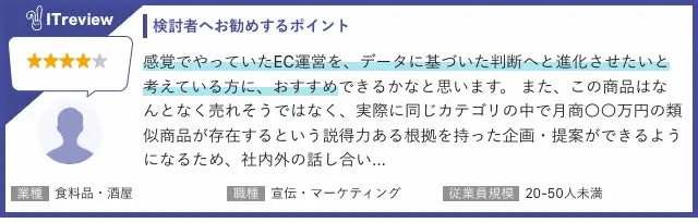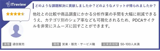 レビューでは、「商品開発」「販売商品の選定・仕入れ」「販売施策」などさまざまなシーンの中で合理的な判断をするにあたり欠かせないツールとしてご活用いただいているとのお声を多数いただいています。