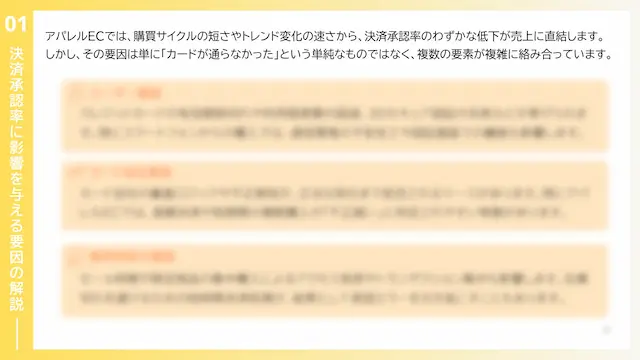本レポートでは、アパレルECにおける決済リスクを多角的に分析しています。具体的には、決済承認率に影響を与える主な要因の解説に加え、実際に発生した不正手口と被害事例の整理、さらにアパレルEC特有の狙われやすい商品カテゴリの傾向を取り上げ、業界特有のリスク構造と改善の方向性を明らかにしています。