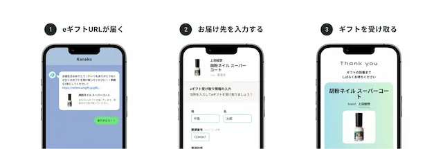 お名前と一緒にメッセージを送ることで、自分の気持ちや感謝の言葉を伝えることができます。 - eギフトURLから住所を入力いただくだけで対象商品が届きます