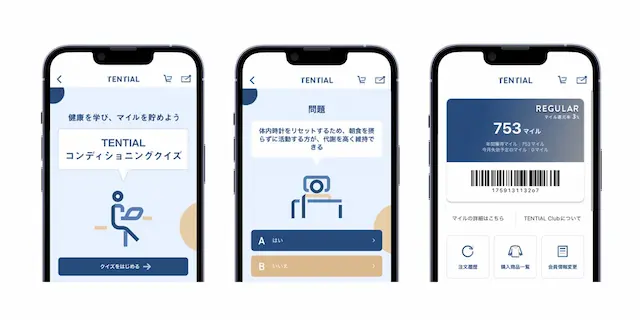 本アプリでは従来運用していた「TENTIAL Club」をアプリにも拡張しています。ログインをすれば、顧客基盤との連携により会員情報が紐付き、マイル数と会員ランクをアプリ画面で簡単に確認できます。また、アプリ独自コンテンツとして注目されるのは、アプリ限定の「コンディショニングクイズ」です。睡眠・食事・運動などのコンディショニングに関する情報を、クイズ形式で「毎日、楽しく、簡単に」触れられ、さらにマイルが貯まる仕組みを実現しています。