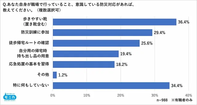- 職場での個人の防災行動、「歩きやすい靴」が36.4%と最多、一方で未対応層も約3割。