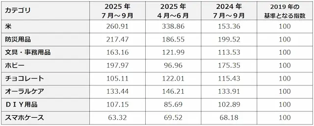 - 文具・事務用品 (+33.7%)、DIY用品 (+25.0%)