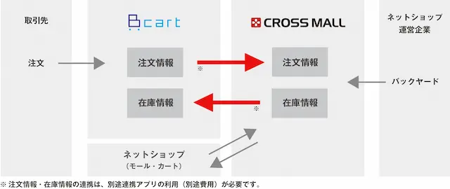 このたびの連携により、「Bカート」を利用し複数ネットショップを展開している企業は、「CROSS MALL」が管理している注文情報を反映することで、随時更新されている在庫数を「Bカート」の在庫数と共有することが可能となり、在庫を一元管理できます。また、売り残しリスクを軽減した商品の出品が可能となるため、業務効率化だけではなく、販売促進にもつなげることができます。「Bカート」に出店されていないネットショップ運営企業には、業務の変更なしに新たな販路を検討できる連携となります。