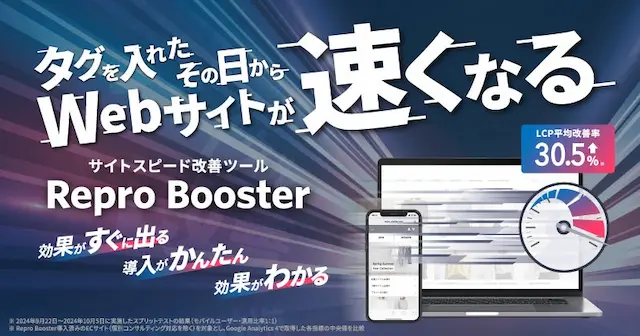 当社が提供する「Repro Booster」は、タグを設置するだけでその日からWebサイト全体の表示速度を高速化する特許技術を用いたサイトスピード改善ツールです。サイトスピードが速くなるだけでなく、導入・運用の工数がほとんどかからないことを特長としています。