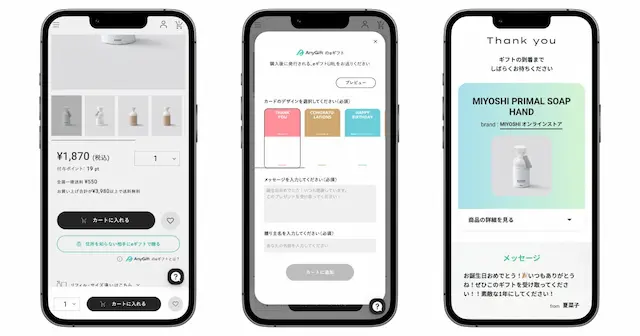 AnyReach株式会社(本社:東京都港区、代表取締役:中島 功之祐)は、ミヨシ石鹸株式会社(本社所在地:東京都墨田区、代表取締役社長:三木 晴信)が展開する「MIYOSHIオンラインストア」にギフトサービス『AnyGift(エニーギフト)』の提供を開始しました。