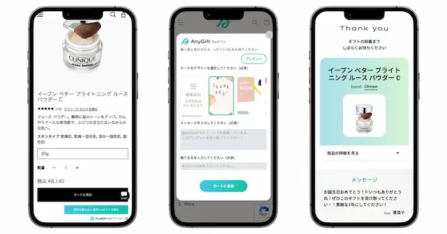 AnyGiftは、相手の住所を知らなくてもLINEやメールで贈ることができる"eギフト機能"をECサイトに組み込むことができるサービスです。この取り組みにより、「クリニーク 公式オンラインショップ」にて人気の製品がeギフトとして贈れるようになります。