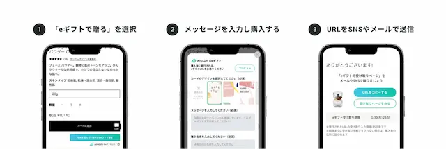 『AnyGift(エニーギフト)』は、相手の住所を知らなくてもLINEやメールで贈れる"eギフト機能"を、自社ECサイトに組み込むことができるサービスです。自社ECサイトにおけるギフト購入・リピーターを増やすことで、売上向上が期待されます。