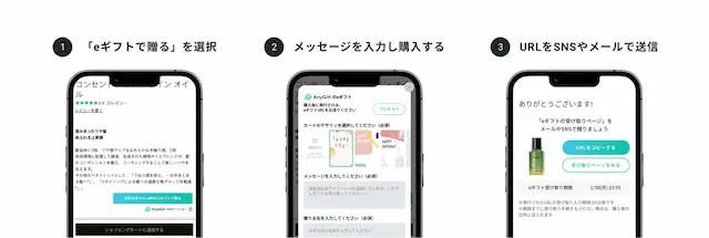 - 購入が完了すると、eギフトの受け取りURLが発行されます。LINEなど各SNSやメールでURLを伝えることでeギフトを贈ることができます。