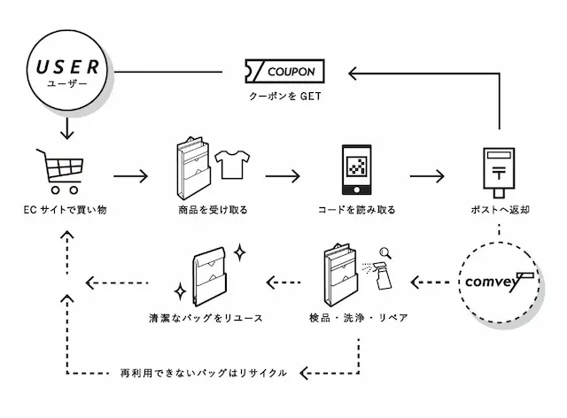 comveyのシステムが導入されたECカートでは、消費者は梱包方法をダンボール等の通常の方法にするかシェアバッグにするかを選択できます。届いたシェアバッグはポストに投函するだけで返却が可能で、返却確認ができたら消費者はクーポンを獲得でき、システム導入ブランドの一部で次回ご注文時に使用できます。comveyへ返却されたバッグはクリーニング・修繕が施されたのち、再びEC事業者へと提供されます。