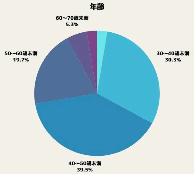 年齢は40代が最も多く39.5%、次いで30代が30.3%、50代が19.7%という結果でした。30歳~60歳未満が89.5%と約9割になり、幅広い年齢層の方が取り組まれていることがわかります。