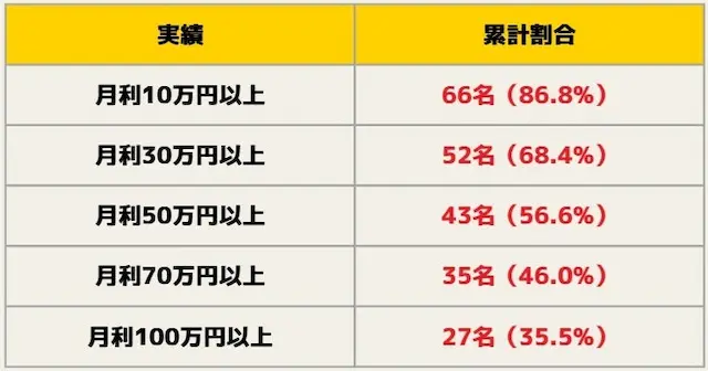 最も多かった層は月利100万円以上~300万円未満で全体の28.9%でした。驚くべきは約7割が副業から始めたにも関わらず、月利10万円以上を86.8%(66名)が達成している点です。また月利50万円以上も56.6%(43名)、月利100万円以上も35.5%(27名)に昇り、非常に高い再現性を有したビジネスであることが窺えます。