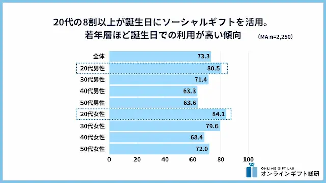 A. 20代女性の84.1%、20代男性の80.5%が誕生日にソーシャルギフトを贈っています。これは全体平均の73.3%を上回る数値です。