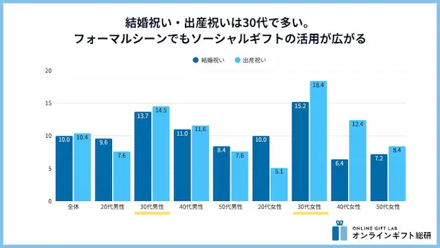 出産祝いでは30代女性が18.4%、30代男性も14.5%と全体と比べて高い水準にあります。全体平均の10.4%と比較すると、30代は4〜8ポイント上回っています。