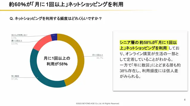 ネットショッピングの利用頻度について、回答者の58%が「月1回以上」利用。対して「年数回」層も一定規模で併存し、利用頻度には個人差が見られます。