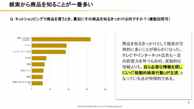 商品を知るきっかけは検索が中心。テレビ・ネット広告も一定の影響はあるものの、自ら探す行動が主流でした。
