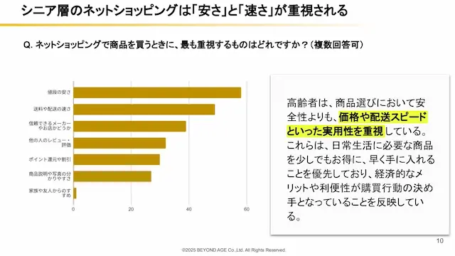 選定基準は価格と配送スピードが上位。日用品を「少しでもお得に、早く手に入れたい」という実用性が強く表れています。