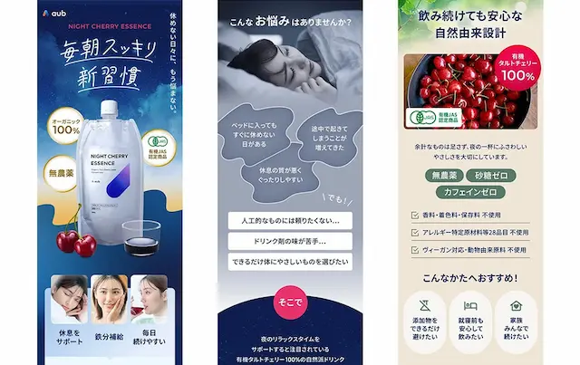 この検証結果をもとに、「NIGHT CHERRY ESSENCE」の訴求戦略を見直しました。「お休み前の生活リズムを整えるタルトチェリー」「有機JAS認証取得」「水・砂糖・甘味料・添加物不使用の果汁100%」という特徴を、市場の不満を解消する差別化要素として再定義しました。さらに、豊富な美容成分(アントシアニン、鉄分、マグネシウム、ビタミン類)を含む「飲みやすい美容ジュース」という特長も踏まえ、睡眠サポートと美容を両立する「睡眠美容」というコンセプトで強調する方針を確認しました。