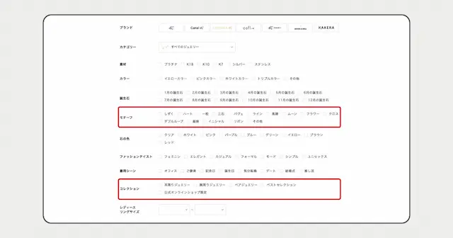 「モチーフ」や「コレクション」といった充実した項目で絞り込み検索ができるようになりました。これらの項目は複数選択が可能なため、より詳細な条件で商品を表示できます。この機能により、ユーザーが求める商品の特徴(ブランド/カテゴリー/素材など)から直感的に絞り込むことができるため、購買体験の向上に寄与しています。