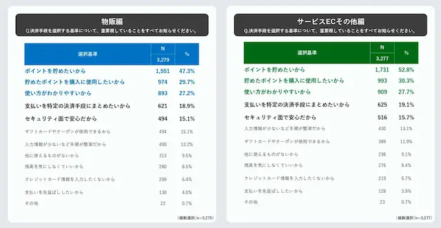 この結果から、消費者は利便性と安全性の両立を重視しており、ポイント経済圏との親和性や操作のわかりやすさ、安心して利用できる体験が利用する決済手段の選択に大きく影響していることが分かりました。