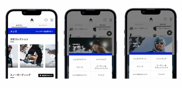 商品画像を活用した直感的で多様なカテゴリー表示や、今注目のコレクション表示を実装することで、様々な角度から商品と出会える導線を整備しています。また、性別情報に基づいた商品ページの出しわけを実現し、情報提供のパーソナライズ化も進めています。これらの施策により、ユーザーは「ほしい情報に素早く辿り着く」ことはもちろん、「新たな商品と偶然出会う」といった、発見のあるアプリ体験を実現しています。