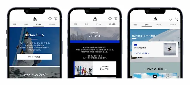 本アプリでは、商品購入という「購買」の要素に留まらず、ECサイトだけでは届けきれなかった「スノーボードファン」の熱量を高めるような、”アプリならでは”のコンテンツを充実させています。具体的には、スノーボードギア、ウェア、バッグ、メンテナンス方法といった多角的なテーマの記事に加え、Burtonスタッフが選ぶお気に入りのギアを紹介するショート動画など、お客様のスノーボードへの想いを継続的にモチベートさせる環境を提供します。さらに、Burtonのパーパスを伝えるコンテンツを通じて、ブランドの根幹にある姿勢や哲学を伝え、共感するファンとともに歩む姿勢を体現しています。