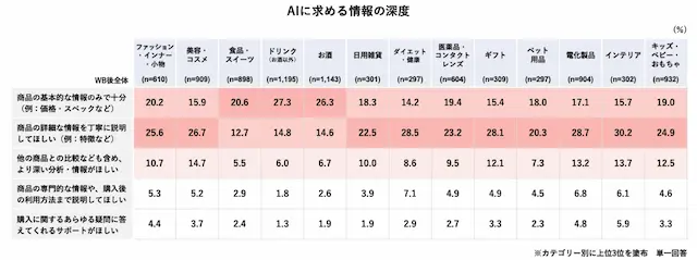 加えて、ライブコマースやメタバースといった次世代技術への関心も増加傾向にあり、AIサービスについては「必要最低限の情報を手軽に得たい」というニーズが明らかになりました。