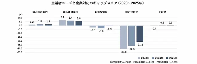 本調査により、購入先企業からのフォローやサポートに対する生活者のニーズは依然として高い傾向にあることが明らかになりました。2023年から2025年にかけて、生活者の「問い合わせ対応」に関するニーズと実際の企業対応とのギャップは徐々に縮小しているものの、ギャップスコアは2023年は-30.8pt、2024年は-26.6pt、2025年は-21.3ptと、他の項目と比較して依然として高い水準にあります。この結果から、企業のサポート体制の強化が引き続き求められていることが分かります。