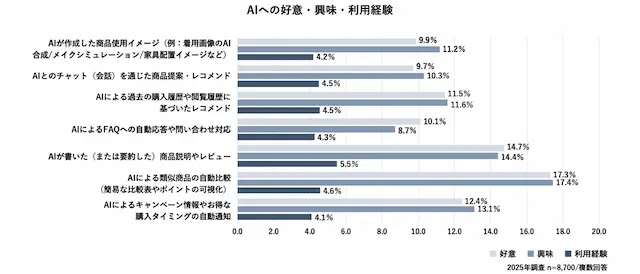 AIサービスに対しても好意的な印象や興味を持つ生活者が一定数存在しています。2025年5月の調査時点では利用経験は限定的な一方、興味はありながらも利用に踏み切れていない生活者がいることが明らかになりました。今後、サービスの認知度向上や体験機会の拡充により、利用が広がる余地が考えられます。