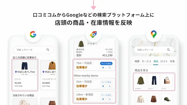 「ローカルインベントリマーケティング」の第一弾としてリリースされた「ライトOMOサービス」は、口コミコム上でGoogleマーチャントセンターとGoogleビジネスプロフィールを連携し、店舗の商品在庫情報を容易に設定・表示できるサービスです。小売事業者様は店舗の商品在庫情報をスムーズに公開でき、「ローカルインベントリマーケティング」を負担なく実施することが可能になります。