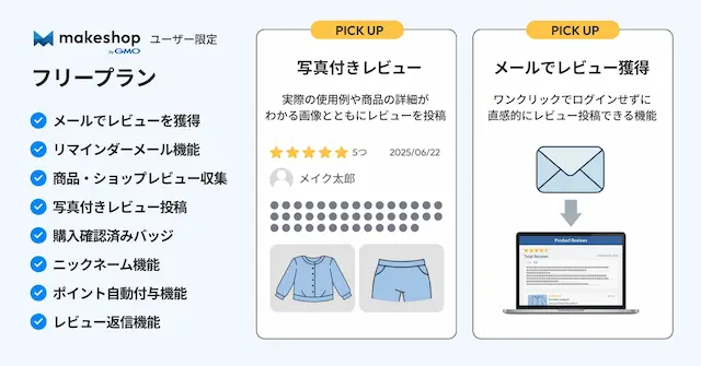 「U-KOMI」連携のフリープランは、「makeshop byGMO」をご利用のお客様向けに特別に用意されたプランです。既存の「makeshop byGMO」ユーザーは、基本のレビュー機能が大幅にアップデートされ、より高度なレビュー活用が可能になります。また、新たに「makeshop byGMO」を利用開始されるお客様は、最初から最新のレビュー機能が実装された状態でご利用いただけます。既存環境にシームレスに統合されており、初期設定もスムーズに行えます(※5)。これまでレビュー導入に躊躇していたEC事業者も、気軽に口コミの獲得とエンゲージメント向上を図ることが可能です。