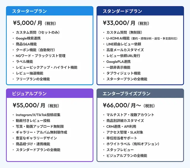 より多彩な機能や高度な活用をご希望される場合には、「U-KOMI」の有料プランに管理画面から簡単にアップグレードできます。有料プランでは、AIによるレビュー要約・返信サポート、詳細なレビュー分析ツール、Google検索・Googleショッピング(PLA)との連携機能など、より高度な機能をご利用いただけます。レビュー運用の効率化だけでなく、ECサイト全体の集客力・購入率向上にも大きく貢献します。