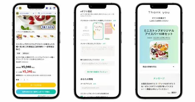 今回、当社のAnyGiftの提供により、「ミニストップ オンライン」にて一部の商品がeギフトとして贈れるようになります。