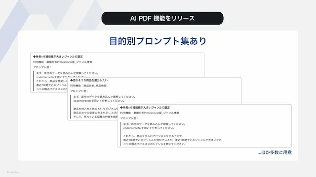 AI用PDFを生成AIに取り込むことで、日々の分析から“次の打ち手の仮説検討”までのスピードを高めます。