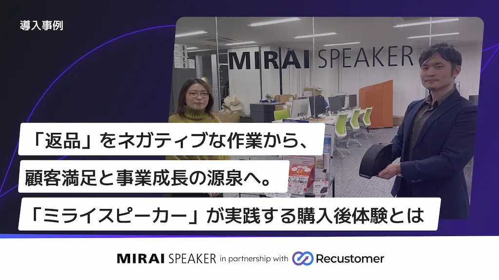 Recustomer株式会社(本社:東京都中央区、代表者:代表取締役 柴田 康弘、辻野 翔大、以下:Recustomer)は、株式会社ミライスピーカー(所在地:東京都中央区、代表取締役社長:山地浩、以下:ミライスピーカー)において、顧客体験向上と返品業務の効率化を目的に「Recustomer 返品・キャンセル」が導入されたことをお知らせします。