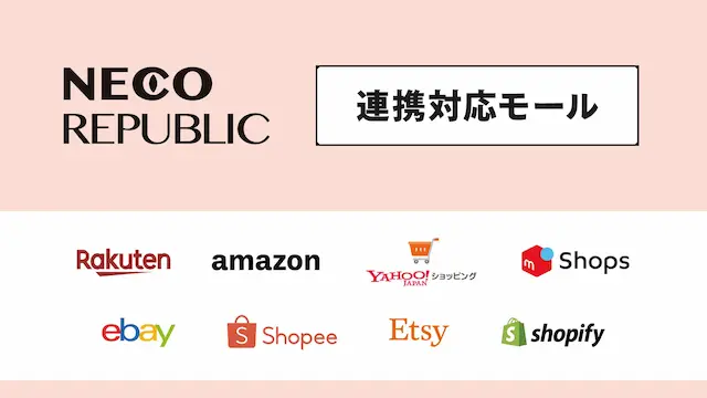 出店者は、ネコリパブリック独自の管理画面で商品を登録するだけで、以下の主要ECモールに自動反映されます。