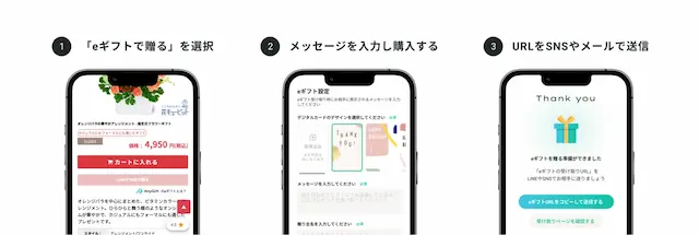 - 購入が完了すると、eギフトの受け取りURLが発行されます。LINEなど各SNSやメールでURLを伝えることでeギフトを贈ることができます。