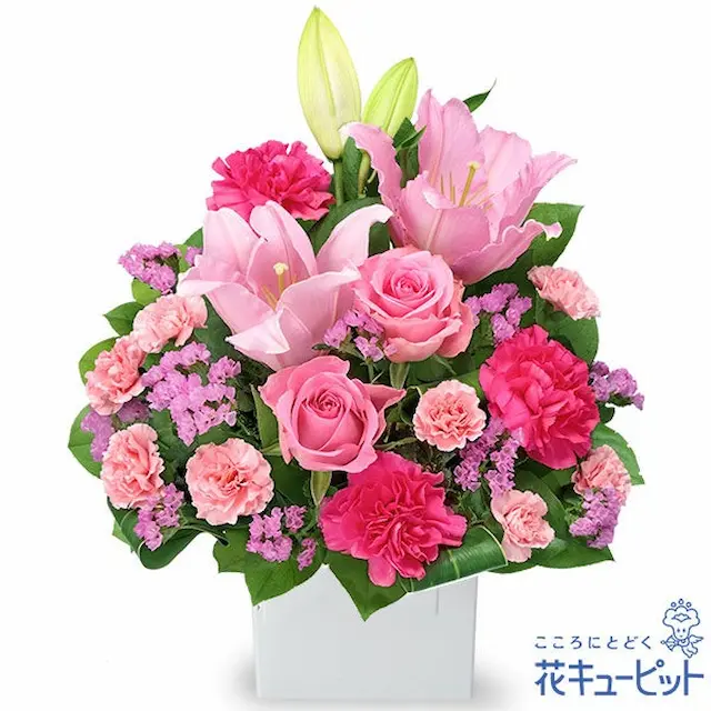 存在感のあるユリが映える、ピンクの花々でまとめたアレンジメント。人気の高いピンクのバラもあわせて、上品な印象に仕上げました。開店祝い・開業祝いなどのフォーマルな贈り物のほか、目上の人やお世話になった方へのプレゼントに最適です。