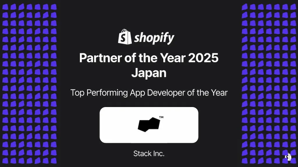 株式会社Stack(本社:東京都渋谷区、代表取締役:福田涼介、以下Stack)は、世界最大級のコマースプラットフォーム「Shopify(ショッピファイ)」の日本法人 Shopify Japan株式会社(所在地:東京都渋谷区、日本カントリー・マネージャー:馬場 道生)が発表した2025年度最も活躍したパートナーを表彰するアワード「Shopify Partner of the Year 2025 - Japan」において、「Top Performing App Developer of the Year」を受賞したことをお知らせいたします。
