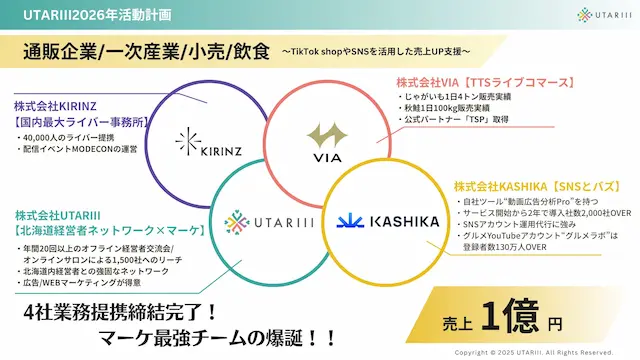 北海道の地方創生を目的としたプラットフォームの構築を目指す株式会社UTARIII(本社:北海道札幌市、代表取締役CEO:安達さやか)は、2025年11月27日に法人を設立したことをお知らせいたします。2025年、年間20回以上の経営者交流会・北海道と東京を繋ぐEzoEdo(エゾエド)を開催してきた実績をもとに、『ビジネスの力で北海道を元気に!』をスローガンとして、北海道創生プラットフォーム企業として北海道のためになる事業を多数展開して参ります。また、本設立に伴い、共に北海道経済を牽引し、30億円企業への道のりを歩む「スポンサー」の募集を開始いたしました。