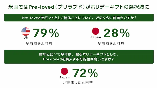 日本では28%にとどまっているものの、72%が「昨年と比較して、Pre-lovedを贈り物として選ぶ可能性が高まった」と回答しており、今後ユニークな一点物や価値あるヴィンテージ品を贈る価値観が広がる余地があると言えます。