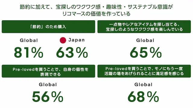 リコマースの最大の動機は節約であり、調査によると世界の消費者の81%が「節約のため」と答えています。日本でも物価が上昇しており、その影響で63%がリコマースを「節約のため」と回答しています。これにより、質の良いPre-lovedを選択する賢い消費が今後広がることが期待されています。