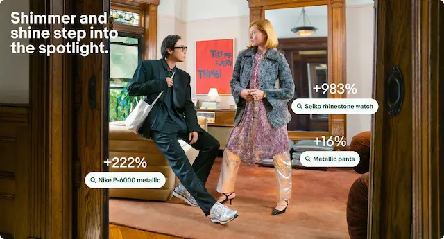 ラインストーン付きのセイコーの腕時計は検索数が983%増加し、Nikeのメタリック「P-6000」スニーカーも222%と注目を集めています。さらに、Y2Kリバイバルの影響でメタリックパンツも再びトレンドに(16%増加)なっています。
