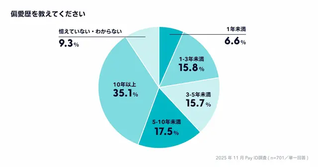 偏愛対象にハマっている期間は「10年以上」が最多。一度ハマると長期間続く傾向あり。