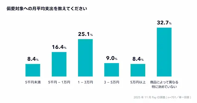 偏愛消費の月平均支出については、毎月一定金額を支出している方が67.3%で、うち「1〜3万円」が25.1%と最多となりました。