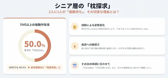 この背景には、「加齢による姿勢変化」「首肩の違和感への敏感さ」「その日の体調に合わせたいというニーズ」があるとみられ、より良い1個を探し続ける探求心が複数所有を後押ししています。