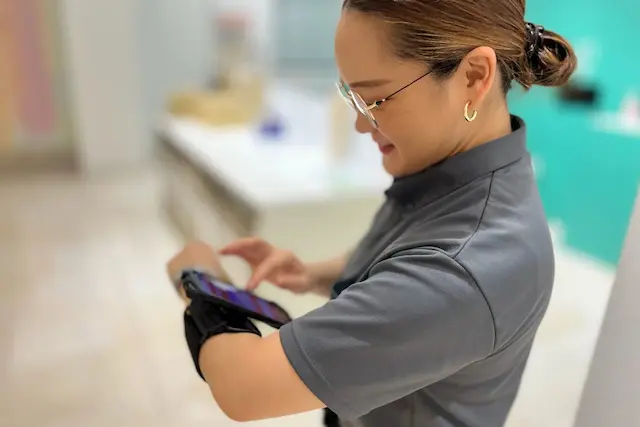 館内物流の現場では、慢性的な人手不足やアナログ運用による業務の属人化が課題となっています。「トコハコ」はシンプルな設計で直感的に操作でき、業務フローの標準化やスキルの平準化を実現します。さらにウェアラブルデバイスの活用により、片手での操作を可能にし、荷物を持ちながらでも効率的に作業を進めることができ、生産性を大幅に向上させます。