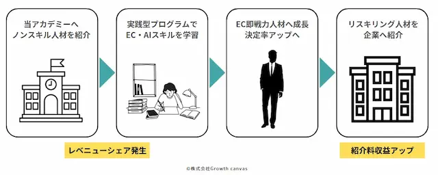 株式会社Growthcanvas(本社:福岡市、代表取締役:野邊祥一朗)は、人材紹介会社向けに「ECマーケター創出アカデミー」のレベニューシェア型提携プログラムを、2026年2月より開始いたします。本プログラムは、人材紹介会社が抱える「ノンスキル・塩漬け登録者」を、最短1ヶ月でEC即戦力人材へと育成し、レベニューシェアによる安定収益を創出する新たなモデルです。EC市場は継続的な成長を続ける一方で、実務経験を有する人材が慢性的に不足しており、多くの企業が採用難に直面しています。人材需要が極めて高い市場において、「決定困難な登録者」を「高付加価値人材」へと転換し、紹介料に依存しない収益構造の実現を目指します。