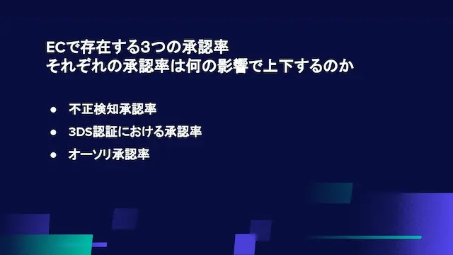 セッションでは、3Dセキュア認証の義務化に伴う決済承認率の改善について議論が行われました。特に、3Dセキュア導入前後でのオーソリ承認率の変動とその影響に焦点を当て、実際の企業データをもとに、3Dセキュア認証パターン①、②、③の違いや、それが与える影響について深掘りしました。