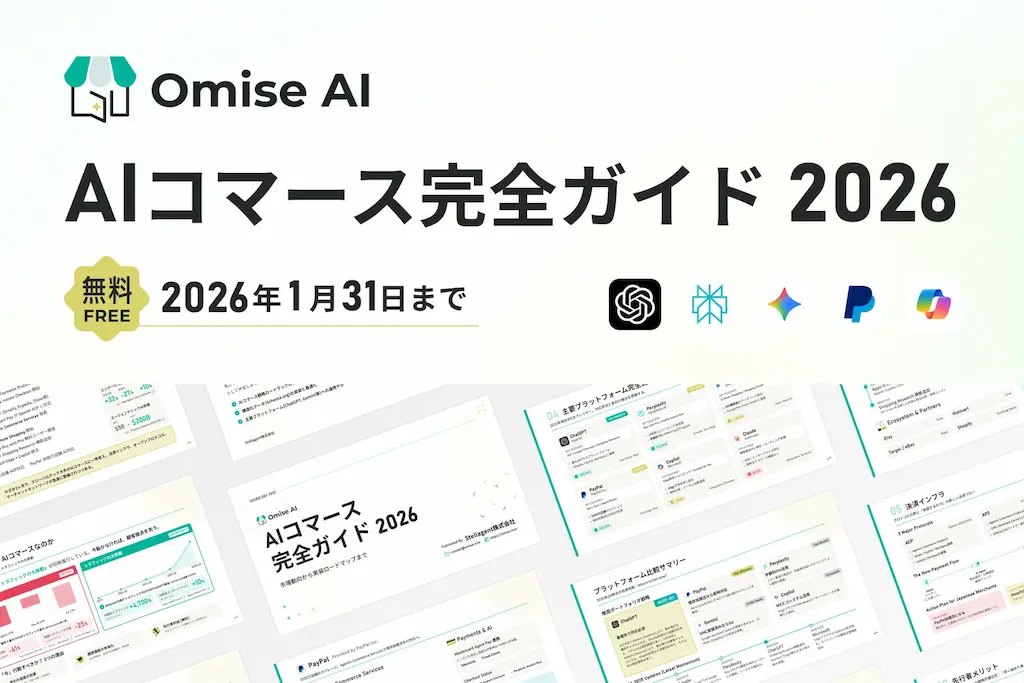 AI(人工知能)を活用したサービスを展開するStellagent株式会社(本社:神奈川県横浜市、代表取締役:鈴木 章広、以下「当社」)は、AIコマース導入支援サービス「Omise AI(オミセ エーアイ)」の正式リリースを記念し、EC・D2C事業者向けの無料ホワイトペーパー『AIコマース完全ガイド2026』の提供を2025年12月24日より開始いたしました。本ガイドは2026年1月31日(土)まで無料でダウンロードいただけます。