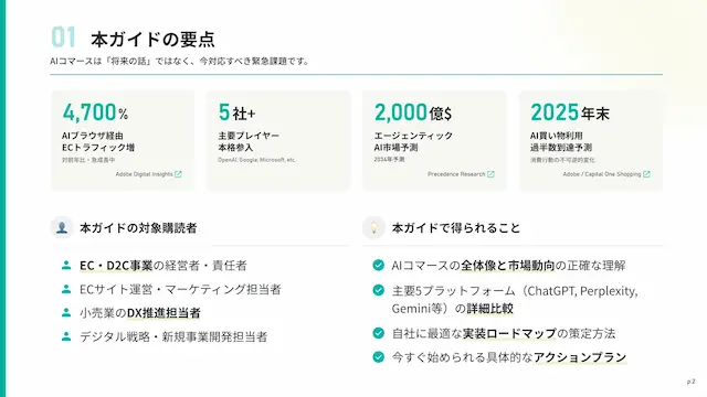 本ガイドは、AIコマースの市場動向から具体的な実装方法まで、EC事業者が今すぐ知るべき情報を全29ページに凝縮した資料です。単なるトレンド紹介ではなく、「各AIプラットフォームは今どこまで進んでいるのか」「EC・小売事業者は何を理解し、何を判断すべきか」という観点で構成しています。